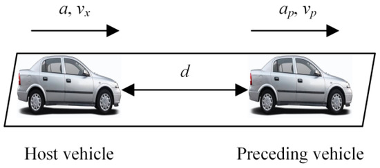 The function of ACC is to take over the longitudinal motion control of host vehicle to make it run at the driver’s preset longitudinal speed or car-following distance. The longitudinal kinematic diagram of host vehicle and preceding vehicle is shown in Figure 4.