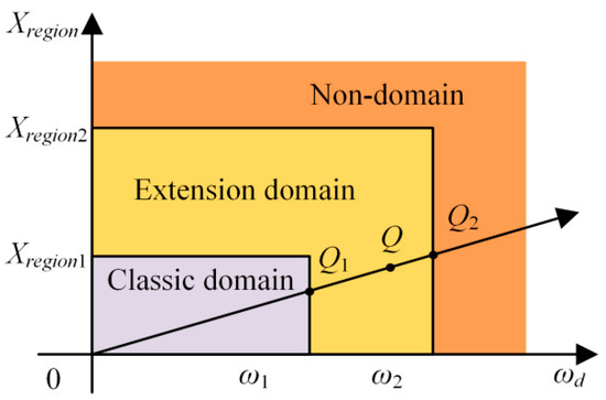 Compared with the result of whether the vehicle status is in the stable region or not, it will help to improve the performance of control system if more detailed information, i.e., the degree of vehicle lateral status is known, and then we can design the control method according to that degree. In extension control, the “degree” above was defined as “dependent degree”. The ideal point in the extension set is the original point O which represents the longitudinal car-following distance error, Xregion and ωd are zero. The point Q is supposed as a point in the extension domain. Connecting the point O with the point Q, the intersection points of the line OQ and the domains’ boundaries are the points Q1 and Q2, respectively. Obviously, in 1-D extension set of car-following distance error, the points Q1 and Q2 correspond to Δd1 and Δd2 respectively. As shown in the Figure 7, the line segment OQ is the shortest distance for the point Q to approach the ideal point O. In the extension sets, the extension distance is defined as the distance from a point to a set, which is defined in a 1-D coordinate system. Therefore, it is required to convert the extension distance of 2-D extension set of lateral stability to a 1-D extension form, as shown in Figure 8.