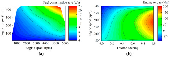The fuel consumption is shown in Figure 9a. The desired longitudinal acceleration is realized by the engine map which is shown in Figure 9b. The throttle opening is determined through the look-up table by utilizing engine speed and desired engine torque. The brake pressure of rear wheel is calculated by inverse brake system. As ACC and DYC system usually does not need too large braking deceleration, it can be considered that there is a linear relationship between the brake pressure Pb and braking torque Tb at the wheels [28], as shown in Equation (40).