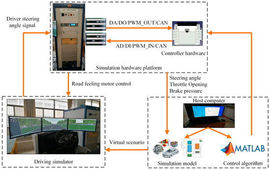 As ACC and DYC systems always work with the driver, a closed DIL evaluation would be more effective than the open-loop simulations because of the real action of drivers’ steering behavior [13]. Therefore, a driving simulator is used in the DIL tests for coordinated multi-objective ACC, as shown in Figure 10. In the simulator, the vehicle model is built in the vehicle simulation software, CarMaker. The coordinated multi-objective ACC controller is implemented with MATLAB/Simulink.