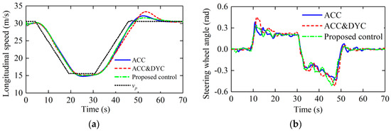 The traditional constant weight ACC and the constant weight ACC and DYC are denoted as “ACC” and “ACC&DYC” in the simulation results, respectively. The parameters in the simulation model are shown in Table 1. The type of tire model used in CarMaker is magic formula tire model “MF_205_60R15”. The values “205”, “60” in name “MF_205_60R15” represent the tread width and flat ratio of tire. The letter “R15” indicates that the tire is a radial tire and “15” is the outer diameter of rim.
