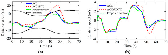 It can be seen from Figure 13 that for the constant weight ACC&DYC, when the host vehicle decelerates, the additional braking force will make the longitudinal car-following errors smaller than the constant weight ACC and proposed control, but when the host vehicle is in an accelerating process, the additional braking force will make the longitudinal car-following capability worse. When the distance error is close to the limit value, the proposed control will increase its weight according to the degree of approaching the limit value to keep the distance error within the limit value as far as possible. As can be seen in Figure 13a, the distance error with the proposed control is kept within the driver sensitivity limit, while the errors with the other two controllers exceed the limit value.