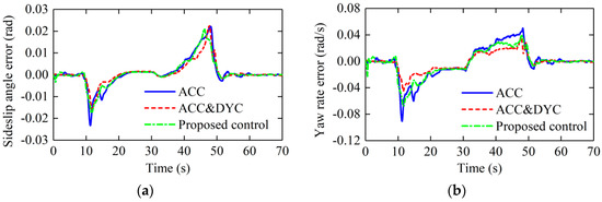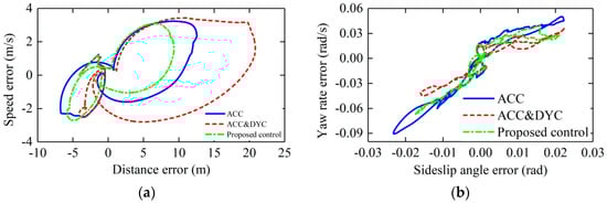In terms of lateral stability control, as can be seen in Figure 14, the maximum yaw rate errors with constant weight ACC, constant ACC&DYC and the proposed control are about 0.091 rad/s, −0.045 rad/s and 0.067 rad/s, and the maximum sideslip angle errors with constant weight ACC, constant ACC&DYC and the proposed control are about 0.023 rad, −0.023 rad and 0.021 rad. With the proposed control, the maximum yaw rate error and sideslip angle error are both in a small range. As shown in Figure 15, in the aspect of lateral stability errors, ACC&DYC has the best control effect. However, in the aspect of longitudinal tracking errors, the maximum distance error with ACC&DYC has exceeded 20 m which is too large for driver’s sensitivity limit. Although the lateral stability errors are smaller with ACC&DYC, it sacrifices too much longitudinal car-following performance. By supervising the risk of losing lateral stability and then apply the corresponding control strength of DYC system, the proposed control realized coordination of car-following performance and lateral stability, so as to ensure that the car-following errors and lateral stability errors are both in a relatively acceptable range.