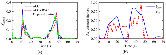 The proposed control determines the weight of the distance error by the dependent degree KACC(S) which can reflect the control effect of the longitudinal control. The proposed control determines the weights of sideslip angle error and yaw rate error by the dependent degree KVLS(S) which can reflect the risk of losing vehicle lateral stability. As can be seen from Figure 16b, when the longitudinal distance error increases, the KACC will be increased to adjust the weights and ensure the longitudinal car-following capability; when the value of driver steering wheel angle and Xregion increase, the KVLS will be increased to adjust the weights and ensure the lateral stability. The maximum errors and Xregion with three controllers are shown in Table 2. Obviously, the overall performance of the control system is improved. The proposed control can intelligently determine the weight matrices by the control effect of the longitudinal distance error and the risk of losing lateral stability. Thus, on the premise of ensuring the car-following performance and lateral stability, the fuel economy and longitudinal ride comfort are improved as much as possible.