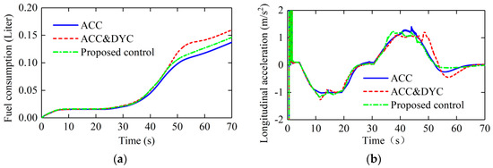 From the perspective of fuel economy and longitudinal ride comfort, the fuel consumption with ACC is the lowest because of zero additional yaw moment, i.e., additional braking forces are zero. The fuel consumption with ACC&DYC is the highest because of the biggest control strength of DYC system. The fuel consumption with the proposed control is in a medium range so that the vehicle can improve the fuel economy as much as possible on the premise of ensuring the lateral stability.