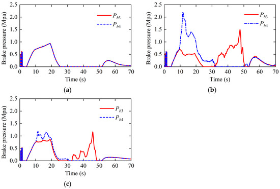 Brake pressure on wheels: (a) brake pressure with ACC; (b) brake pressure with ACC&DYC; (c) brake pressure with proposed control.