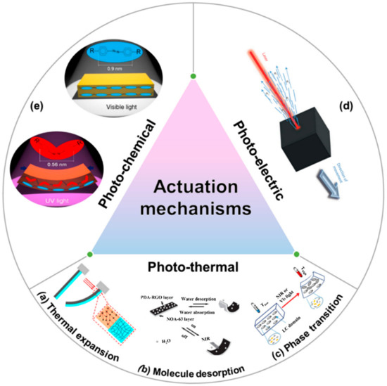 Light-responsive actuators often use intermediate energy-conversion methods to eventually achieve the purpose of mechanical deformation. According to intermediate energy conversion, the actuating mechanism is divided into three kinds: photo-thermal conversion actuation, photo-chemical conversion actuation, and photo-electric conversion actuation [15,36]. Among the above three actuating mechanisms, photo-thermal and photo-chemical actuation are the most commonly used, especially when combining polymer with advanced light-responsive nanomaterials. Figure 1 shows the representative actuators of several photo-responsive mechanisms.