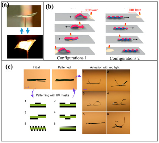 - Han, D.-D.; Zhang, Y.-L.; Ma, J.-N.; Liu, Y.-Q.; Han, B.; Sun, H.-B. Light-Mediated Manufacture and Manipulation of Actuators. Adv. Mater. 2016, 28, 8328–8343. [Google Scholar] [CrossRef] [PubMed]