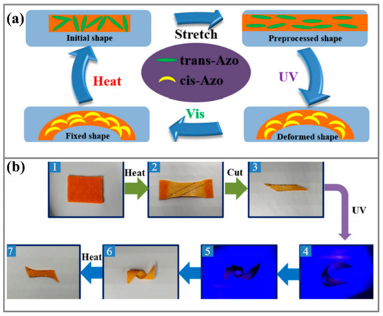 Schematic illustration of light-responsive shape memory properties: (a) mechanism in molecular structure; (b) deformation in the experiment (1) original shape, (2) stretched shapes, (3) sample cut from the stretch sample at an angle of 30° to the stretching direction, (4) curling sample upon UV light, (5) curled sample after UV light irradiation, (6) curled sample fixed at room temperature under visible light irradiation, (7) the recovered sample after reheating to 80 °C [71]. Permission from Elsevier.