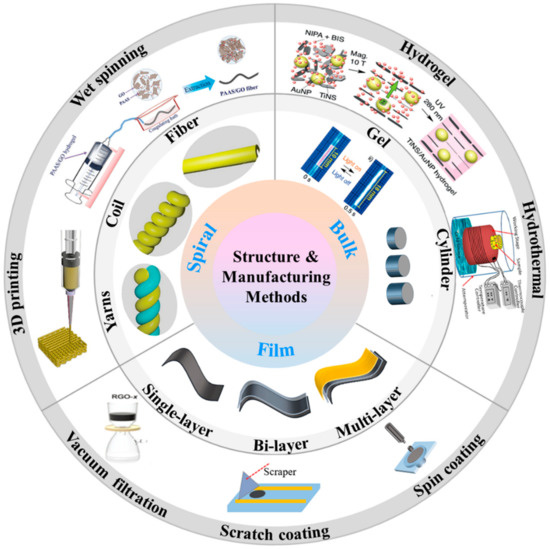 It can be seen from Figure 4 that the preparation method of the film-structure actuator is the simplest. In addition, spiral-shape, light-responsive actuators are more comfortable in combination with smart textiles. Next, the preparation methods of the above three kinds of structure of light-response actuators will be described and analyzed in detail.