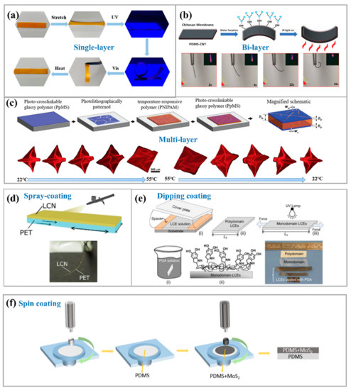 (a) Actuating behavior of single-layer, light-responsive actuator based on polyurethane shape memory polymer [71]. Permission from Elsevier. (b) Schematic illustration of the fabrication process of the PDMS-CNT/chitosan actuator and its actuating behavior [80]. Permission from Royal Society of Chemistry. (c) Fabrication of self-folding polymer multi-layer actuator structure and its thermally actuating behavior [81]. Permission from WILEY.VCH. (d) Schematic diagram of the preparation of PET/LCN bilayer structure actuator by spray-coating method and photograph of a light-responsive thermoplastic actuator [82]. Permission from WILEY.VCH. (e) Schematic diagram of the preparation of LCEs/PDA bilayer r structure actuator using dip-coating process and samples [83]. Permission from American Chemical Society. (f) Schematic diagram of bilayer film preparation with spin coating.