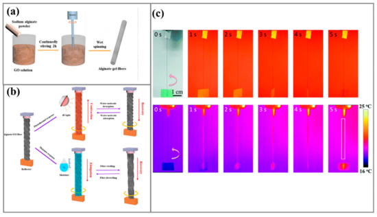 (a) Schematic diagram of the manufacturing process of the fiber-type actuator. (b) Schematic diagram of the reversible rotational motion of the twisted GO/SA fiber-based actuator under on/off light irradiation and moisture [87]. Permission from American Chemical Society. (c) Aspherical load produced a rapid forward and backward movement under on/off infrared light irradiation [78]. Permission from the Society.