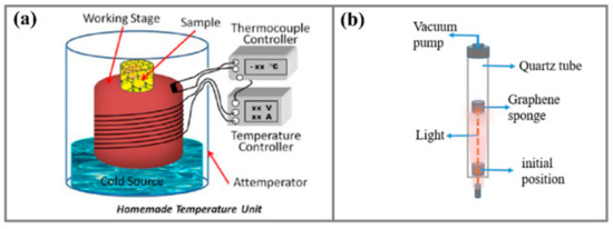 (a) Schematic of the preparation of bulk graphene sponge by hydrothermal method [77]. Permission from Springer Nature. (b) The schematic diagram of the vertical rise of graphene sponge under laser irradiation.