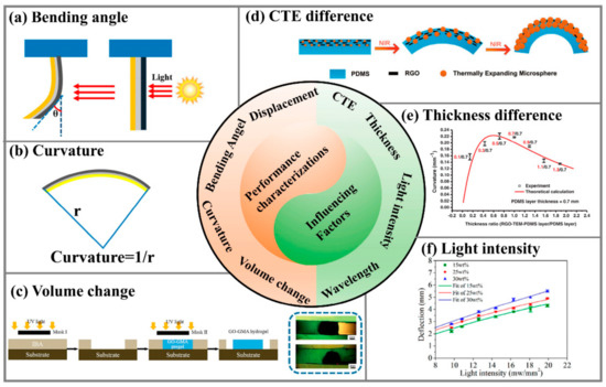 Understanding the performance characterization parameters and influencing factors of light-responsive actuators will help us further apply and optimize its actuation performance. Figure 8 shows several different performance characterization methods and factors that affect actuation performance.