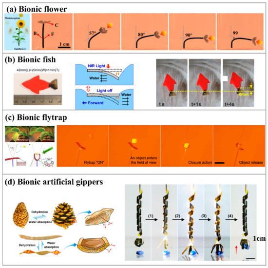 Light-responsive actuators have potential applications in many fields, such as in the field of bionics and microfluidics. Bionics refers to the discipline that imitates organisms to build technical devices. Bionics mainly studies the organisms’ ontological structures, functions, and working principles and transplants these principles into engineering technology. Exploring the application of flexible actuators in bionics, manufacturing intelligent bionic devices with mechanical energy output is the current research focus at this stage, including smart bionic flowers, intelligent crawling robots, intelligent grippers, and so on.