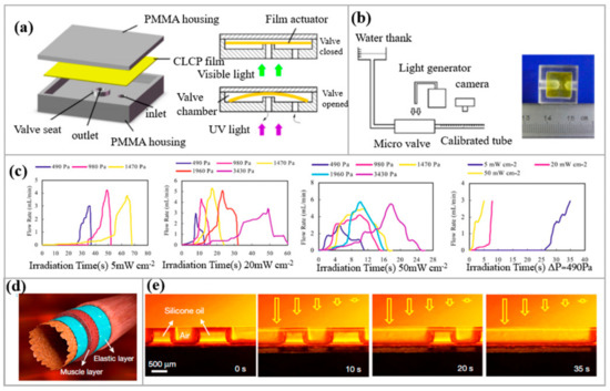 (a) Schematic diagram of structure model of light−actuated liquid crystal film micro-valve. (b) Cross-sectional schematic diagram and working principle of light-actuated liquid crystal film micro−valves. (c) The relationship between fluid flow and irradiation time under different conditions [95]. Permission from Springer Nature. (d) Schematic diagram of the artery wall structure. (e) The light-induced movement of the silicone oil plug in a tubular actuator fixed on the substrate [96]. Permission from Springer Nature.