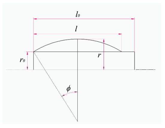 In this section, the correlation between the geometrical and functional parameters and λ is reported. The profile of the straight-fibers muscle under deformation is well described by a circular shape []. With reference to Figure 2, where half of the axial sections of the deformed and undeformed sector of the muscle are presented, the following formulations can be expressed: