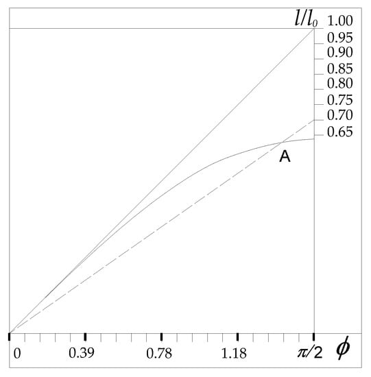 The two equations together give the value of λ when l0, r0 and l are known. In particular, the transcendental Equation (9) can be graphically solved in order to achieve the value of ϕ for a given l/l0.