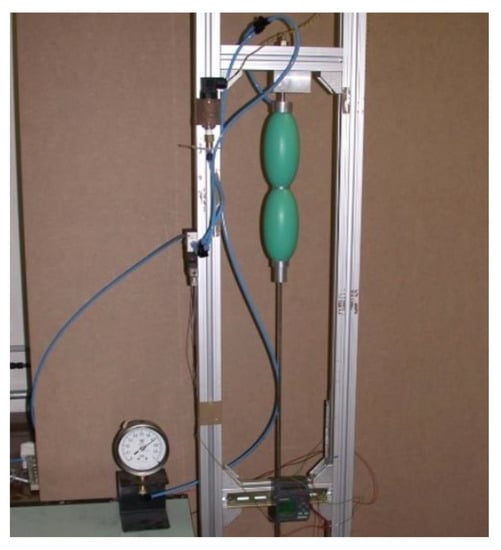 Traditional pneumatic actuators are widely adopted in industrial automation due to the simple availability of the air, clean operation and their low cost. Traditional actuators are adopted in high speed, high repeatability and high durability operations where only the two extremity positions of the moving components are required. On the contrary, pneumatic muscle actuators (PAMs), belonging to the class of the non-traditional pneumatic actuators, are adopted in slow operations where smoothness of behavior and compliance are required. These operations are typical in biomedical [,,] and medical [,] applications, in bio-inspired devices [] and in robotic applications [,,] where the human user is directly involved and where the presence of rigid moving components could be dangerous for the human operator. Thus, in addition to the aforementioned applications, PAMs are well suited for human–machine interaction because of their intrinsic safety. Recently, human–robot interactions have been increasing due to the increase of robots in medical applications and to the use of collaborative robots in domestic and industrial applications. For traditional industrial robots that must ensure high performances in terms of rapidity, accuracy and repeatability [], safety is ensured by placing robots in human-free environments. On the contrary, collaborative robots, and more general human–robot interactions, must ensure safety in any possible situations: unexpected trajectories, failure of the control system and human errors. Variable stiffness actuators (VSAs) represent a technique to make human–robot interaction intrinsically safe: VSA allows a robot to have low stiffness at high speed, to reduce the risk of injuries in the case of impacts and high stiffness at low speed, to reduce oscillations in the acceleration and deceleration phases and to stably maintain certain configurations []. VSA can be implemented by several technical solutions [,,,] where a spring is always adopted for the transmission in traditional robots. Antagonistic-controlled stiffness is the technical solution that provides for stiffness adjustment of two nonlinear springs mounted in antagonistic mode (example, biceps and triceps muscle combination). In this context, pneumatic actuators are absolutely indicated because volumes of air act as variable stiffness springs []. Even better are pneumatic muscles, able to increase the intrinsic safety by compliance of the constituent material and the absence of moving rigid components.