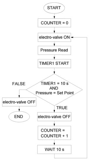 A PLC Siemens Logo! was adopted for the test control: for each cycle, the pneumatic electro-valve is switched to send air to the muscle until reaching the pressure value necessary for the required shortening; then, air is sent to the external environment. A timer allows for waiting the proper time in order to switch the electro-valve again. If the pressure value is equal to zero for more than 10 s, it means that the rupture of the muscle occurred, and the control system stops the test. A linear potentiometer, Gefran (Brescia, Italy) TKDA-N-1-E-B01D-H-V (f.s. 150 mm), was adopted for measuring the shortening of the muscle during the set-up of the experimental test bed; then, it was removed during tests. A counter is activated upon reaching the rest condition. In Figure 5, a flow chart of the algorithm for the control of the test bench is presented.