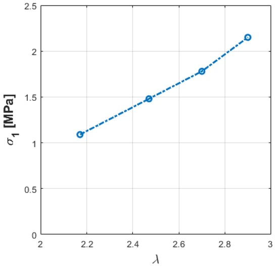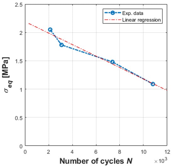 Data in Table 2 were adopted to plot graphs useful for the procedure for fatigue life prediction. With reference to Equation (8), Figure 6 reports the stress values σ1 as a function of λ; Figure 7 reports the stress σeq values as a function of the fatigue life duration, expressed in terms of number of cycles.