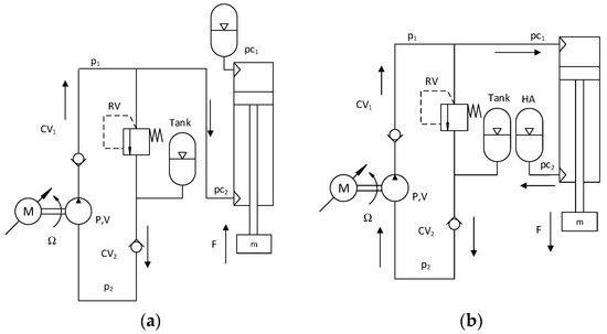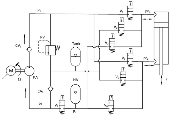 The proposed system is presented in Figure 1. The system includes an AC servo motor (M), a fix displacement hydraulic pump (P), a hydraulic cylinder, seven directional controlled valves (V1,…,V7), a tank (Tank), a high pressure hydraulic accumulator (HA) and a relief valve RV. In the system, a low pressure accumulator is used as a tank to boost the pump via check valve CV2. Two check valves (CV1, CV2) pilot the flow direction to the pump. In this system, the speed of the hydraulic cylinder is controlled by adjusting the speed of the pump. The high pressure accumulator is used to store recovery energy and serves as a booster of the pump.