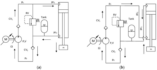 The working modes of the system are described in following section. Using conditions in Table 1, the hydraulic circuit is redrawn according to each mode as follows. The normal-out and normal-in modes are described in Figure 2a,b, respectively. This is an open circuit EHA system and outputs of the cylinder are controlled by adjusting speed of the pump. This is an open circuit because the out port of the cylinder and suction port of the pump are connected directly to the tank. High force is an outstanding characteristic of the normal-out mode.
