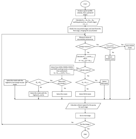 The supervisory controller selects the working mode and calculates the pump speed set point. The diagram algorithm for selecting the working mode is described in Figure 9. Then, the working mode is achieved by switching the on/off valves as described in Table 1. In this study, the working mode is selected so that the system has the highest velocity factor or force factor as well it recovers energy of external force for a given cycle. A working mode is selected for each phase and this process is taken place in advance for a given cycle. This strategy is suitable for so many industrial applications such as pressing machines where each pressing profile of a product is usually able to be pre-estimated. This is an open-loop time based control strategy, so a period is used to change the phases of the system.