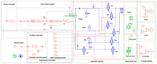 In the first study, only the energy flow in the hydraulic system is investigated in order to neglect the effect of the efficiency of the electric motor as well the servo controller. The pump efficiencies are studied in depth because they depend on the torque and the speed of the pump. As a result, the supplying energy is defined as the mechanical energy at the pump shaft level. The energy in the display block shows the supplying energy of the pump, slider and the accumulator. This energy is estimated by Equations (3)–(5).