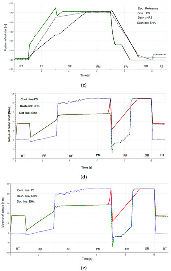 Torque of the shaft pump in different control strategies is shown in Figure 12e. It is observed that, torque of pump shaft for the NRS or the EHA strategy is low in FR phase cause of reload force of the spring. During this time, the accumulator is charging or the pressure of the cylinder end is increasing for the PS strategy. As a result, the operating pressure or torque is high in this phase.