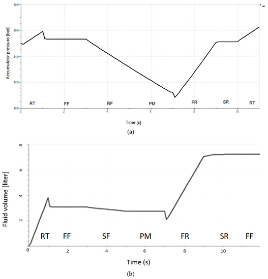 Parameters of the accumulator are shown in Figure 13 that are pressure and flow rate of fluid and volume of gas in the accumulator. Pressure and volume of hydraulic fluid in the accumulator are presented in Figure 13a,b, respectively. At the beginning of the cycle, the gas pressure is 60 bar and it raises to 66 bar at the end the cycle, while the volume of fluid is raised from 0 L to 5.5 L or the volume of fluid increases from 0 to 0.5 L, respectively.