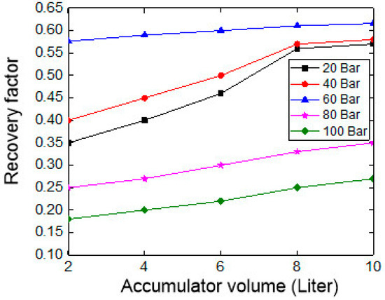 Energy recovery factor versus accumulator volume under the various pressure of the accumulator.