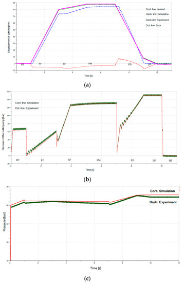 In the same manner of the operation of the simulation model, the real position response of the slider is compared with that measured from the simulation model as shown in Figure 18a. It is noteworthy that the experimental result is in good in agreement with the position error of approximately 1.5 mm in PM phase. Although the pressure response obtained from the experimental appears as the oscillation, it almost tracks well the reference. This oscillating phenomenon is affected by the elasticity of the line system, which indicates that the oscillation of the pressure curve can be reduced according to the increase in the compressibility of the line system. Indeed, installing the accumulator on the return line leads to the elasticity of this line increased. The result is the oscillation of the pressure P3 (plotted by the dashed line in Figure 18c) reduced compared with that of the pressure at the outlet of the pump (denoted by the dashed line in Figure 18b).