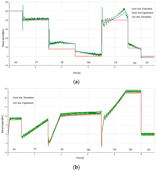 The speed and torque of the pump for PS control strategy by simulation and experiment are shown in Figure 19. It is observed that, both the simulated and measured speed are affected when the system changes its phases. At the beginning of SF phase, torque of the motor is negative because pressure of the inlet port is higher that of the outlet port of the pump. That phenomenal is a result of the phase change of the system from RNOM mode to RUNO mode. The value of motor torque is increased during FR phase and reached the highest value in SR phase due to pressure in the accumulator for recovery modes.