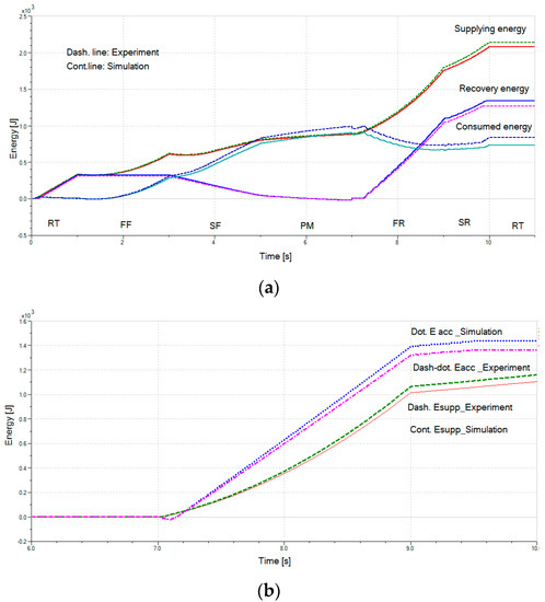 The energy of the system in simulation and experiment for the pressing cycle is described in Figure 20a. The supplying energy is calculated by indirectly measured torque and speed of the motor. It is observed that, there are errors in simulation and measured values for supplying, recovery and consumed energy, in which the value of measured supplying energy is higher than that of the simulation one. While the value of measured recovery energy is lower than that of the simulation one. As a result, the measured consumed energy is higher than that of the simulation one. It is observed that, the system consumes about 770 J while that value in simulation is about 700 J to finish this cycle.