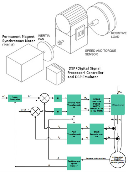 Let us consider the following full-scale 4D model of the permanent-magnet synchronous DC motor (PMSM), whose general view and model block diagram are shown in Figure 1. The model dynamics are governed by the following system of differential equations [30]: