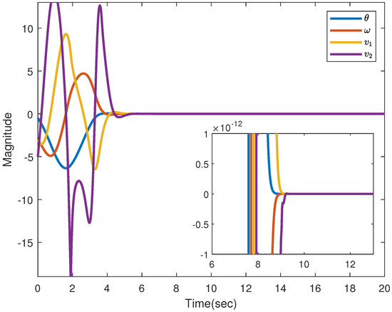 To verify the performance of the proposed control law (21) and (22) in the presence of deterministic disturbances, numerical simulations were run for the system (20) in MatLab 2020a, using the same first nine PMSM parameter values as those in Table 1. The deterministic disturbance was selected as , and the value of the coefficient was calculated according to the PMSM parameter values as . Accordingly, the Lipschitz constant was set to . The newly assigned PMSM parameter values are listed in Table 2.