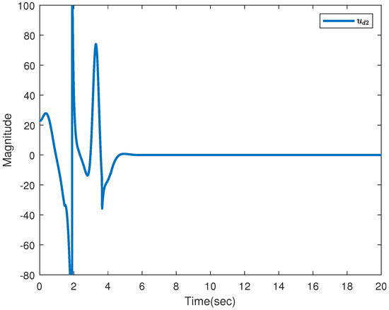 Figure 9 shows that the control input (21) and (22), based on the estimates produced by the observer (16), drives all the states of the full-scale 4D PMSM system to the origin within the predefined time of 20 s, again with the precision , even for high disturbance magnitudes of order . It can be observed from Figure 10 that the magnitude of the nominal control input still remains acceptable. In this simulation, the control input (21) and (22) is activated after s, when the observer (16) converges according to (18), to avoid unreasonably high control magnitudes. Note that the obtained results still provide better convergence precision and a lesser control magnitude than those presented in [17] for close values of the PMSM parameters and deterministic disturbances, even in the presence of additional stochastic noise.