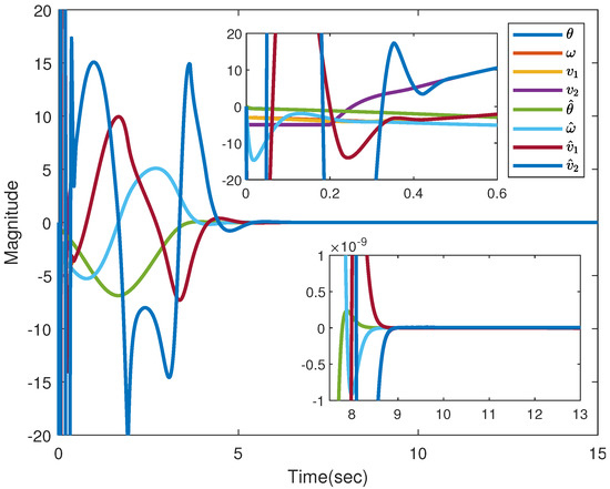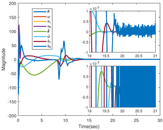 It was assumed that only the variable can be measured. Therefore, the observer (16) was used to reconstruct the unmeasured state variables, and the applied control input (21) and (22) was based on the estimates produced by the observer.