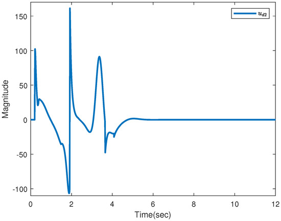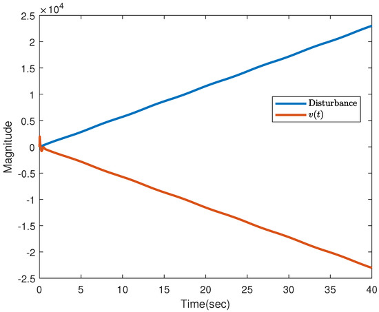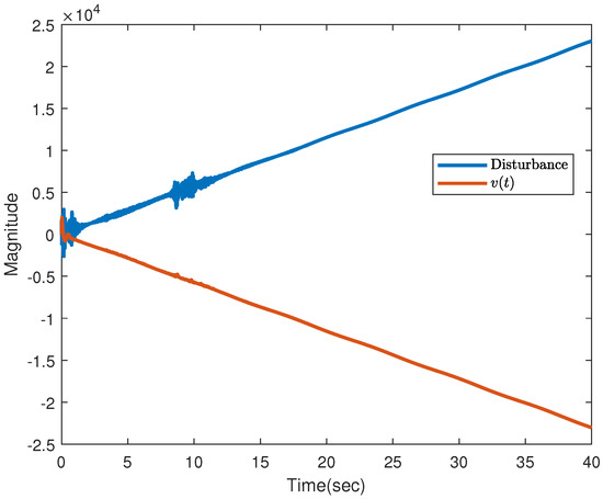 Finally, Figure 11 displays the compensator control input (22) , based on the estimates produced by the observer (16), against the disturbance in the presence of a white noise with diffusion . It can be observed that the control input reliably compensates for the disturbance soon after the initial time moment for a stochastic system as well.
