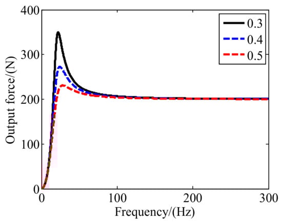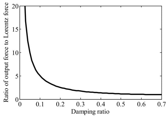 When the damping ratio meets , the ratio of the output force to the Lorentz force can reach a maximum if the forced vibration frequency is consistent with the resonant frequency of the acting part. The influence of damping ratio on F/Fa is shown in Figure 2. It can be concluded that the smaller the damping ratio is, the greater the ratio of the output force to the Lorentz force is. As the damping ratio approaches , the output force is basically equal to the Lorentz force.
