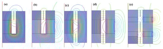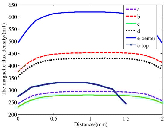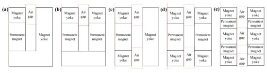 In order to meet the requirements of light weight, small volume and large output force, the structure of the magnetic circuit assembly is quite important. Five kinds of magnetic circuit schemes (a, b, c, d, e) were put forward as shown in Figure 4. NdFeB N35SH and pure iron DT4 were used for simulation respectively. The magnetic flux lines distribution was simulated by 2D Ansys/Maxwell as shown in Figure 5. The magnetic flux density at the center line of the air gap of each scheme is shown in Figure 6. It can be seen that the degree of uniformity of schemes a, b, c and d is better than scheme e. However, the magnetic flux density of scheme e at the center air gap is much greater than other schemes. As the schemes a and b have only one air gap for a coil, schemes c and d have two air gaps, where two coils can be set and double the Lorentz force can be provided. Moreover, scheme e has three air gaps, which can provide greater Lorentz force even though the magnetic flux density at the top air gap and bottom air gap is less than the center. Therefore, schemes d and e may be better than others in terms of the magnitude of the Lorentz force. By considering the application in the frequency range of 100–300 Hz, the eddy current effect of a coil would become a major factor influencing the performance of the actuator. According to part 2, the inductance of the coil needs to be designed as small as possible. In addition, the coil frame with small volume and light mass is superior. Therefore, scheme e may be not a good choice as the coil assembly is complex, which would introduce more eddy current effect. To sum up, scheme d is good with high magnetic flux density and two separate coils can be designed. Therefore, a high mass power ratio can be obtained for the inertial actuator.