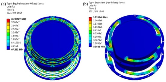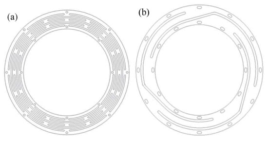 The working frequency of the inertial actuator depends on the suspending system. The slit type leaf spring was used to support the magnetic circuit assembly because of its large radial stiffness and small axial stiffness. Two kinds of leaf springs (a, b) with inner diameter 124 mm and outer diameter 178 mm were designed, as shown in Figure 7. The suspension models with two springs and a mass block was constructed and the properties were simulated by a static structural moduleand modal moduleof Ansys/Workbench as shown in Figure 8. The fundamental frequency, maximum stress and deformation of the two models under 200 N are illustrated in Table 1. The fundamental frequency of scheme a is greater than scheme b, which means that the inertial actuator with scheme b has broader frequency range and can work at the frequency as low as 16 Hz. The fundamental frequency can be reduced by increasing the outer diameter of scheme a, but the volume and mass of the inertial would be increased. Therefore, scheme b is better.
