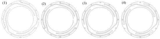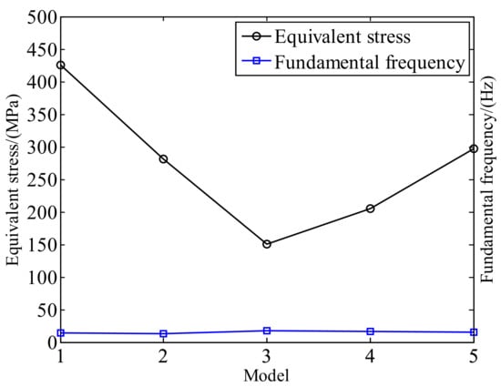 The stress concentration of the leaf spring mainly depends on the parameters of the slit, most of which are relevant to each other. Different structures can be obtained by adjusting the gap length, the gap width and the radius of the end of the gap. Four structures of leaf springs were designed as shown in Figure 9. The equivalent stress and fundamental frequency were simulated and compared in Figure 10 with Figure 7b as model 5. It is obvious that model 3 is better than others as the equivalent stress decrease about 50% compared to model 5.