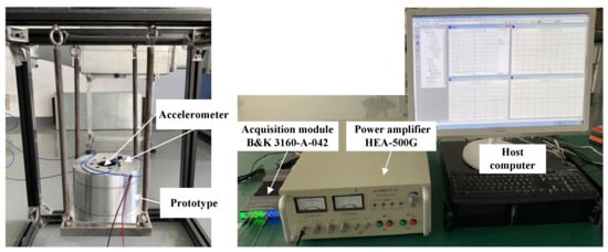 A magnetic inertial actuator with the optimized magnetic circuit assembly and leaf spring was manufactured. The materials used for the magnetic inertial actuator are listed in Table 2. The inner radius of the two cylindrical permanent magnets are 5 mm and 55 mm, respectively, and the outer radius are 45 mm and 65 mm, respectively. The air gap distance is 10 mm. The number of turns of each coil is 240 and the resistance is 5.1 ohms. The total mass is no more than 8 kg, the maximum outer diameter is 178 mm and the total height is 116 mm. A testing device was set up as shown in Figure 11. The inertial actuator was suspended by four springs together with a mass block weight of 25 kg, with which the fundamental frequency is less than 15 Hz.