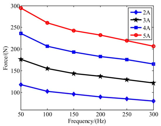 The input current of the inertial actuator was adjusted as 2 A, 3 A, 4 A, and 5 A, respectively. The tested acceleration at frequencies 50 Hz, 100 Hz, 150 Hz, 200 Hz, 250 Hz and 300 Hz were recorded and are shown in Figure 12. It can be seen that the relationship between the output force and the input current is nearly linear at different frequencies. With the increase of frequency, the output force decreases slightly due to the effect of impedance, inductive reactance and eddy current loss. The effective output force of the maglev inertial actuator can reach 200 N and more when the current is 5 A.