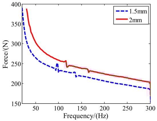 Two leaf springs with 1.5 mm thickness and 2 mm thickness were manufactured. The fundamental frequencies of the actuators with each leaf spring are 14 Hz and 18 Hz, respectively. The initial input current was set as 5 A and the excitation frequency was increased from 20 Hz to 300 Hz as a sweep function. The output force of the inertial actuator was recorded and shown in Figure 13. The leaf spring with a thickness of 2 mm can produce greater force than the leaf spring with a thickness of 1.5 mm as its fundamental frequency is closer to the working frequency.