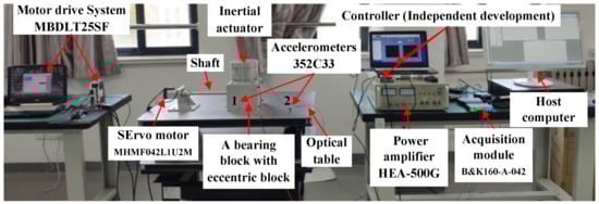 A test system of propulsion shafting was set up for active control as shown in Figure 14. A servo motor was driven by its driver with the speed range of 0–6000 r/min. One end of the propulsion shaft was connected to the servo motor through an elastic coupling, and the other end was connected to the bearing support through a bearing. Eccentric blocks were installed on the shaft next to the bearing to simulate the lateral vibration of the shaft. Two accelerometers were used. One was installed on the bearing block and the other was installed on the optical table, about 50 cm away from the bearing block.