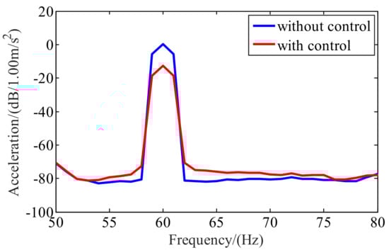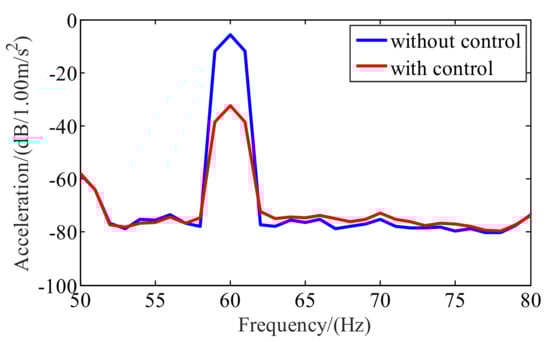 The classical adaptive feed-forward control was used. A secondary vibration source, caused by the inertial actuator, was introduced. The vibrations are of the same frequency and amplitude, but of opposite phases with the original vibration. Then, the original vibration can be coherently offset to achieve the purpose of vibration suppression. Firstly, the servo motor was shut down. A linear spectrum disturbance signal with 60 Hz was sent out by the controller to the actuator through the power amplifier. Then, the test results of accelerometer 1 can be identified and used to design the controller. Test results with and without control of accelerometers 1 and 2 are shown in Figure 15 and Figure 16, respectively.