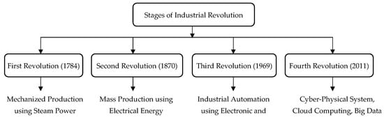 The IR 4.0 is a concept initially conceived by the German nation to illustrate its new strategy of developing adaptable production systems based on internet technology [9,10]. The industrial sector is crucial to every country’s economy and drives progress and development. Industries in any country focus on manufacturing and delivering added value to the products by converting the raw materials into final products [11,12]. The term IR 4.0 became well known in 2011 when a group of representatives from different sectors like politics, business, and academia in Germany promoted this idea to consolidate the competitiveness of German industries [13]. The Federal Government of Germany showcased IR 4.0 as a novel, emerging strategy which facilitates industrial and logistics networks to thoroughly utilize the internationally accessible information and communications systems for an automated interchange of valuable data [14,15]. Aiello et al. [16] presented a decision support structure including automated data collection and analysis methods to evaluate the accurate functioning of the propulsion monitoring system of a ship and for early discovery of nascent breakdowns. In another study, Aiello et al. [17] conducted a gap analysis between existing business patterns and the next-generation digitalized shipping industry. The authors examined the maturity level and the technological obstacles related to smart shipping industry. Frank et al. [18] highlighted the implementation patterns of IR 4.0 enabling technologies used by different manufacturing firms. The authors proposed a conceptual framework for such technologies by dividing them into front end and base technologies. Different stages of the Industrial Revolution are shown in Figure 1.